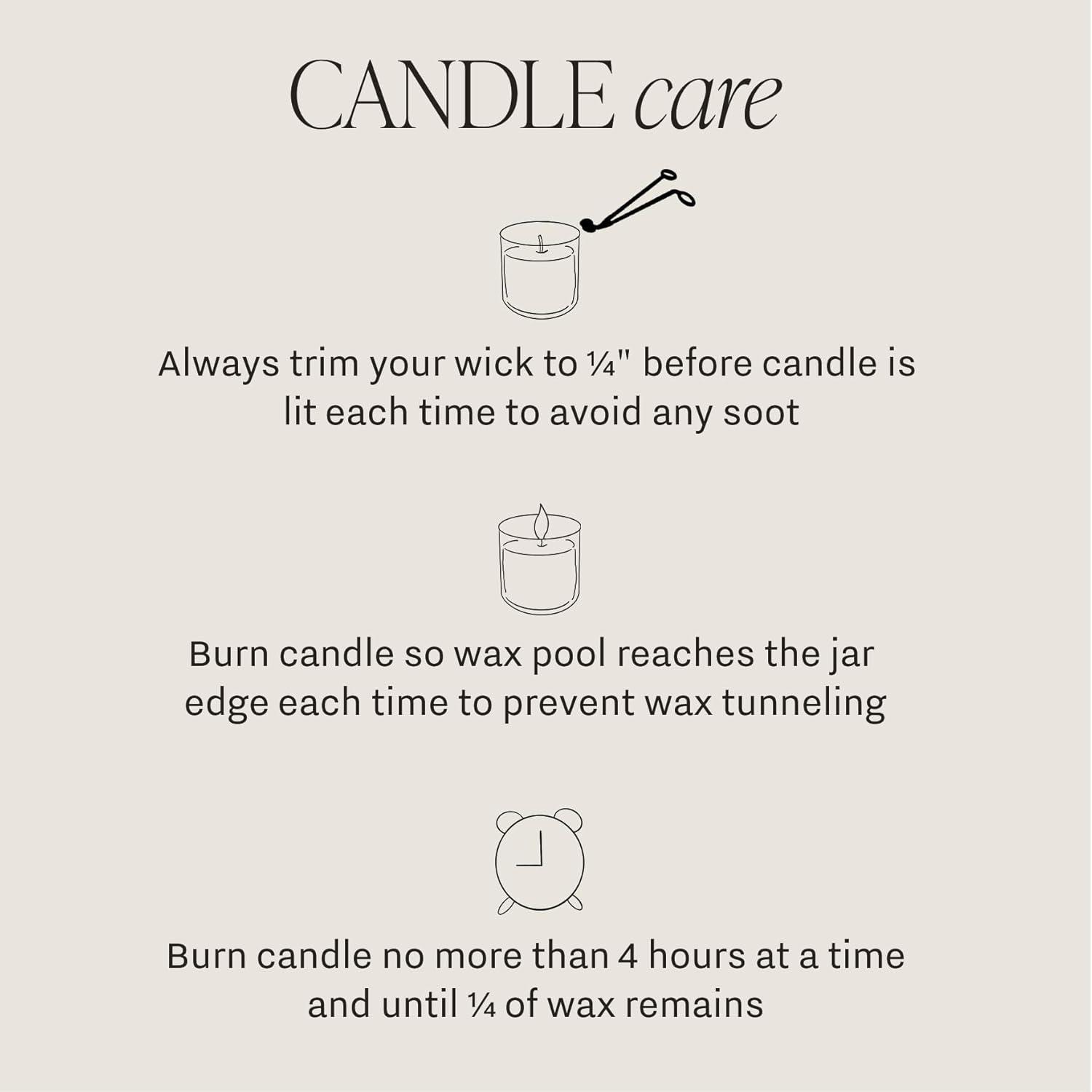 CANDLE CARE: Trim your wick to 1/4″ before candle is lit each time to prevent soot. Burn candle so wax pool reaches the jar edge each time to prevent wax tunneling. Burn candle no more than 4 hours at a time. Do not burn candle with less than a 1/2″ of wax remaining. Keep candle away from fans, open windows, hot surfaces, children, pets. Never leave a burning candle unattended